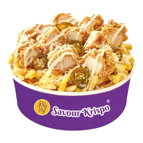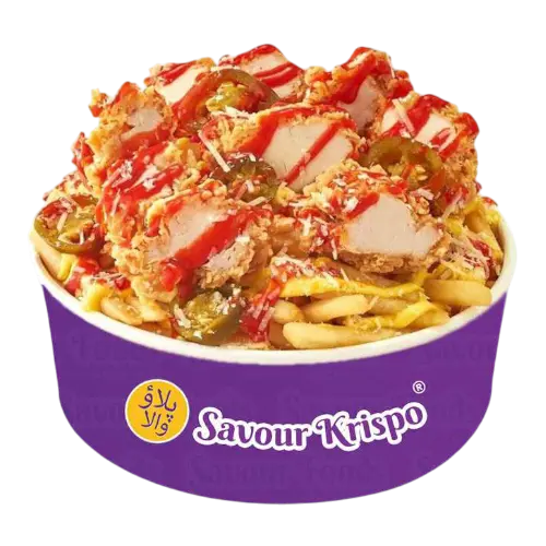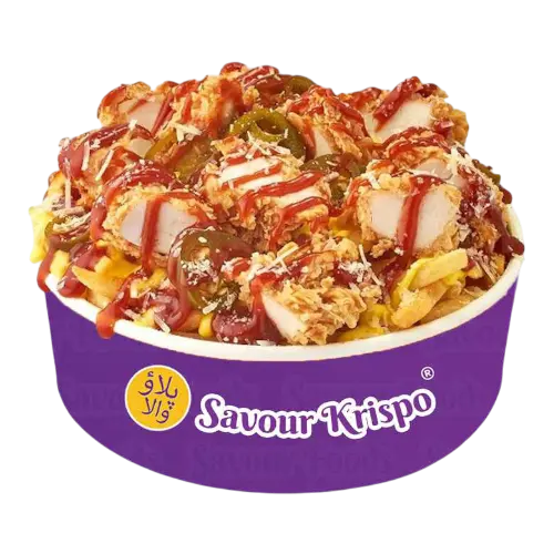 Fries + Krispy Chicken + Spicy BBQ Sauce + Krispo Sauce + Mix chadder cheese