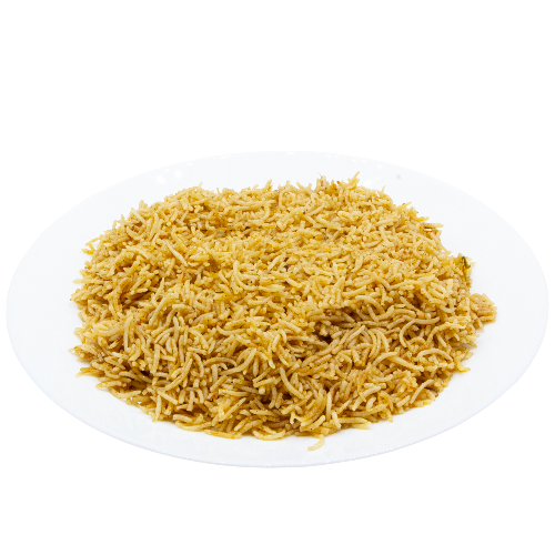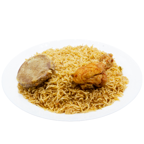 Big portion of traditional savour pilau served with 2 chicken pieces and 2 shami kabab